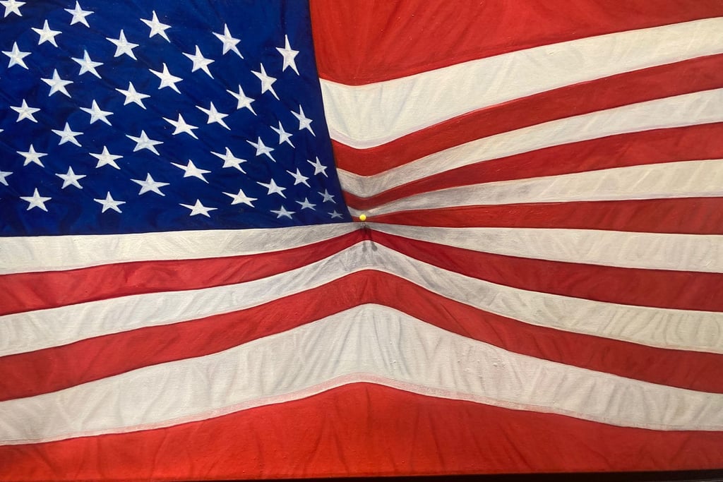 Both artists draw in the United States of America, featuring scenes from history (Zúñiga) and an array of ‘Trump’s Fantasies’ (Mtz Peña), with one wall particularly evocative, centering a painting of the Stars and Stripes (Mtz Peña — ‘Watching the American Debacle’) in the middle of an agglomeration of other works. The US flag is puckered in the center, however, its bubble burst by the presence of a pin which seems to draw all the air out of it. Mtz Peña is sensitive to the possibilities of presenting subtle shifts in the iconography of national symbols, and he addresses Mexico’s recent political histories with a painting of Mexico’s own emblematic flag, all appearing perfectly normal, until you realize that in fact the snake is eating the eagle, a power shift on its presentation through history.