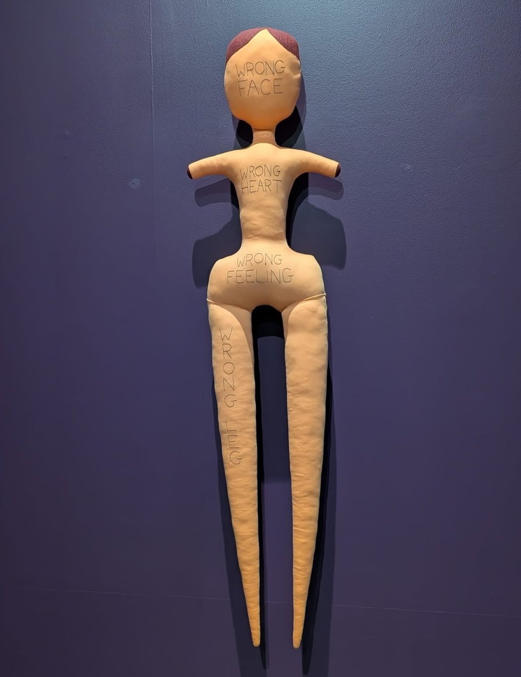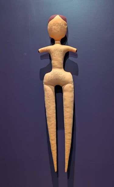 In Goring’s art, comfort and resistance are stitched into the same form. Wrong Doll (2022), for instance, embodies the emotional and physical struggles that haunt the body, her body parts labeled in large letters: "Wrong face" across her head, "Wrong Heart" on her chest, "Wrong feeling" on her stomach, "Wrong Leg" down her limb. Just like her sisters, Wrong Doll is hand-sewn and stuffed by Goring herself.